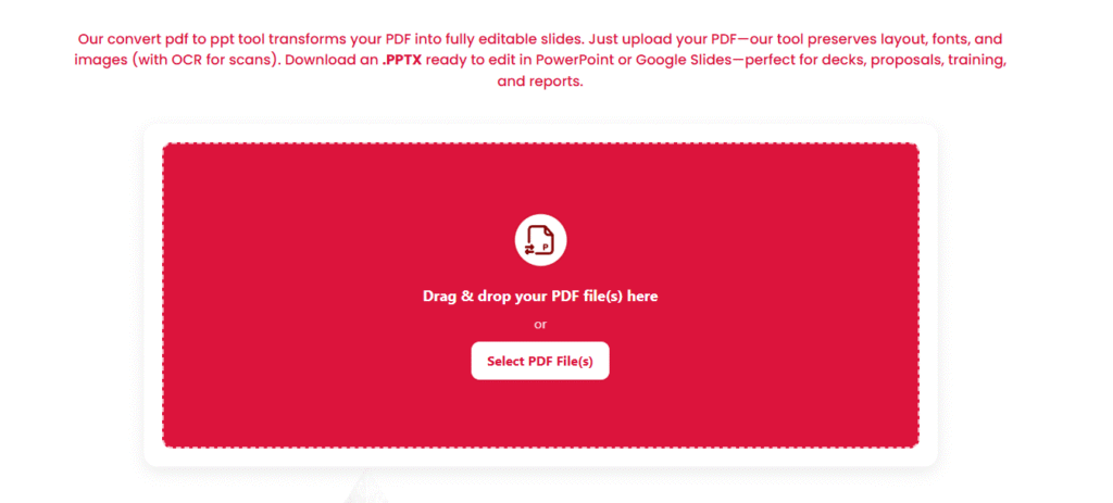 Reuse without rebuilding. Reports, brochures, white papers, and proposal PDFs often mirror slide-ready layouts. Converting saves hours versus re-creating slides by hand.