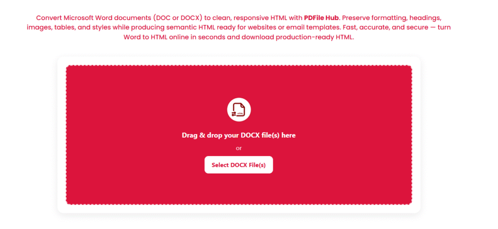 - Open PDFileHub → Word to HTML.